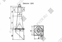 Циклон пылеуловитель ЦОК 1 с обратным конусом состоит из корпуса с входным патрубком, внутреннего конуса, выхлопной трубы и пылесборника. Пылесборник может быть в виде бункера или выдвижного ящика. Короткая часть цилиндрического корпуса переходит в расширяющийся книзу конус, непосредственно присоединяющийся к пылеприемному бункеру. При установке агрегата на кронштейне бункер имеет коническую форму, а к пылевыпускному отверстию может подсоединятся затвор типа «мигалки» или шиберный затвор. Рекомендуется установка на кронштейне аппарата диаметром не более 300 мм. Для повышения эффективности пылеосаждения и предохранения осевшей пыли от взмучивания и уноса из бункера в нижней части агрегата устанавливается внутренний конус. Угол при основании внутреннего конуса зависит от рода и характера осаждаемой пыли: для сухой пыли — 45°, для сажи и талька — 60°.