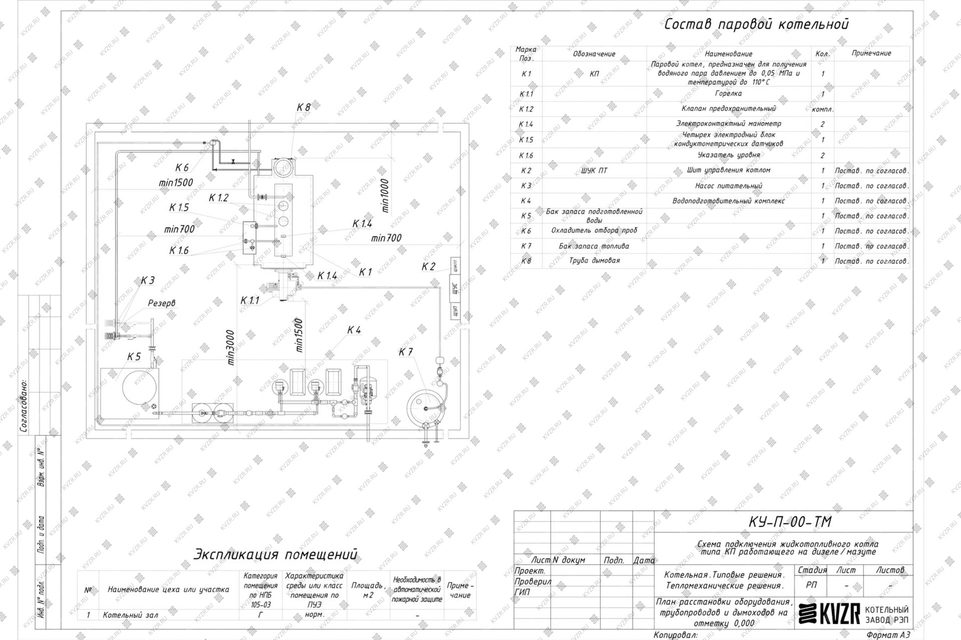 Чтобы правильно подключить дизельный паровой котел 2000 кг / 2 т пара -115 °С -0,07 МПа / 0,7 кгс/cм² в котельной необходимо оставить проемы для обслуживания оборудования во время эксплуатации. На представленной здесь схеме обозначены их размеры. Кроме того, в данной примерной схеме монтажа паровых котлов и оборудования указан перечень минимально необходимого вспомогательного оборудования.