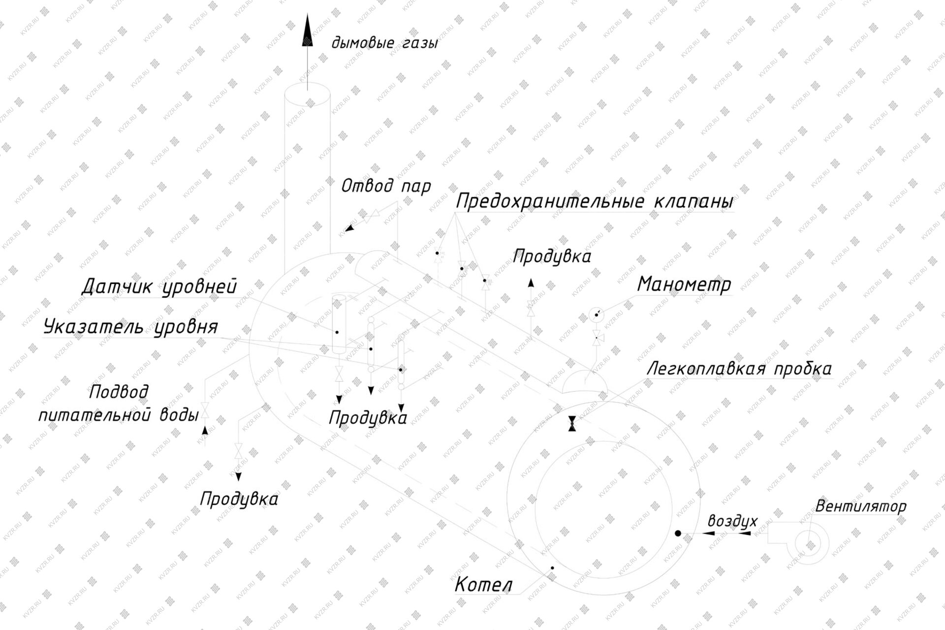 Теплообменник изготавливается из двух стальных цилиндров разного диаметра, вставленных один в другой и соединенных между собой фланцами и конвективными трубами. В верхней части теплообменника приварен паросборник, представляющий собой полуцилиндр. Конвективный трубный пучок соединяет верхнюю и нижнюю часть водяной рубашки котла, пар образуется при испарении нагреваемой воды и собирается в паросборной камере, далее через паропровод направляется потребителю на технологические нужды. Дымовые газы проходят через трубный пучок и выходят в верхней части котла. В передней части жаровой трубы размещена топка с чугунными колосниками для каменного и бурого угля, а в задней части - конвективный пучок труб. Топливо загружается вручную, паропроизводительность регулируется путем увеличения или уменьшения количества загружаемого в топку угля. Температура сухого насыщенного пара низкого давления регулируется изменением давления пара, чем ниже давление пара, тем ниже температура. Для безопасности работы в передней части жаровой трубы в верхней части установлена легкоплавкая пробка – предохранительное устройство прямого действия. Легкоплавкая пробка предназначена для сброса пара во внутренний объем топочной камеры в случае упуска воды ниже аварийного уровня и достижения фактического уровня воды на работающем котле ниже верхней кромки жаровой трубы. При этом легкоплавкая пробка перестает охлаждаться котловой водой и нагревается до температуры газов в топочной камере. Из-за нагрева наполнитель легкоплавкой пробки плавится и выдавливается давлением пара в топочную камеру, при этом сбрасывается давление пара и дополнительно гасится пламя.