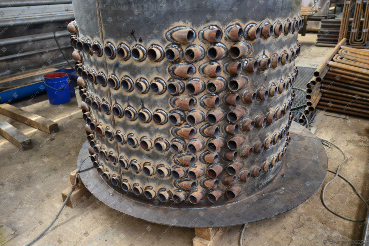 Трубный пучок соединяет верхнюю и нижнюю часть водяной рубашки теплогенератора. Теплоноситель образуется при испарении нагреваемой воды и собирается в верхней части агрегата, над которой выполнена сборная камера, далее через паропровод направляется потребителю на технологические нужды.