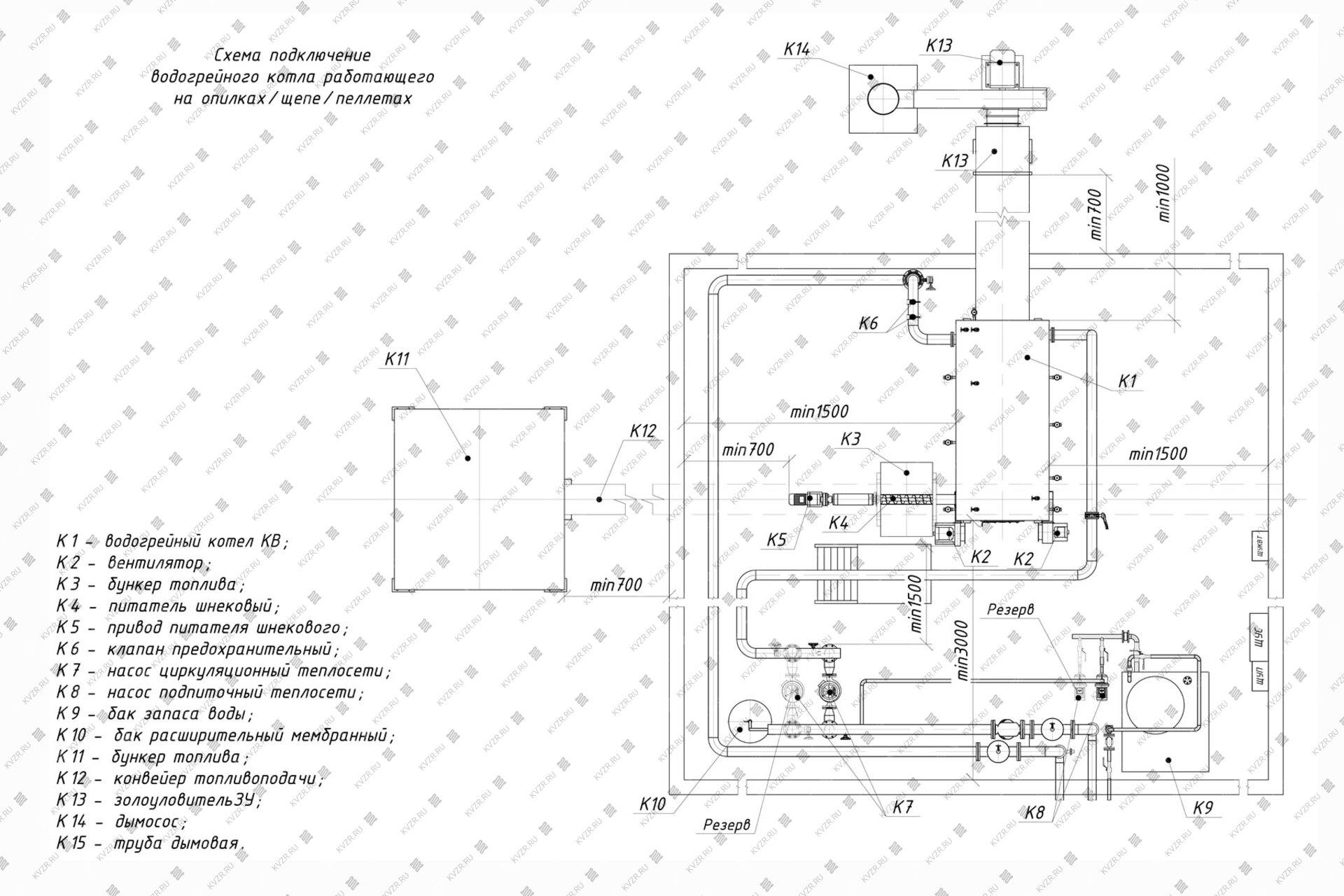 Чтобы правильно подключить котел 0.7 МВт на щепе в котельной необходимо оставить проемы для обслуживания оборудования во время эксплуатации. На представленной здесь схеме указаны их минимальные размеры. Кроме того, в данной примерной схеме монтажа водогрейных котлов и оборудования указан перечень минимально необходимого вспомогательного оборудования для правильной работы котла.